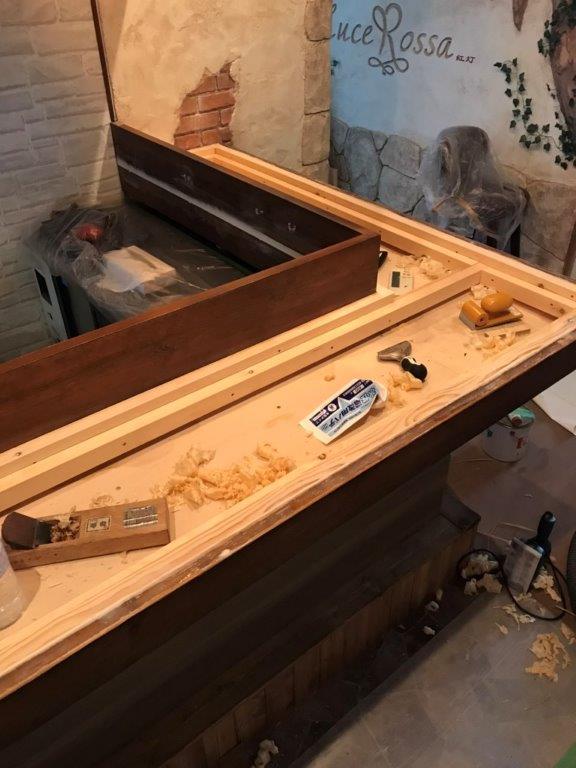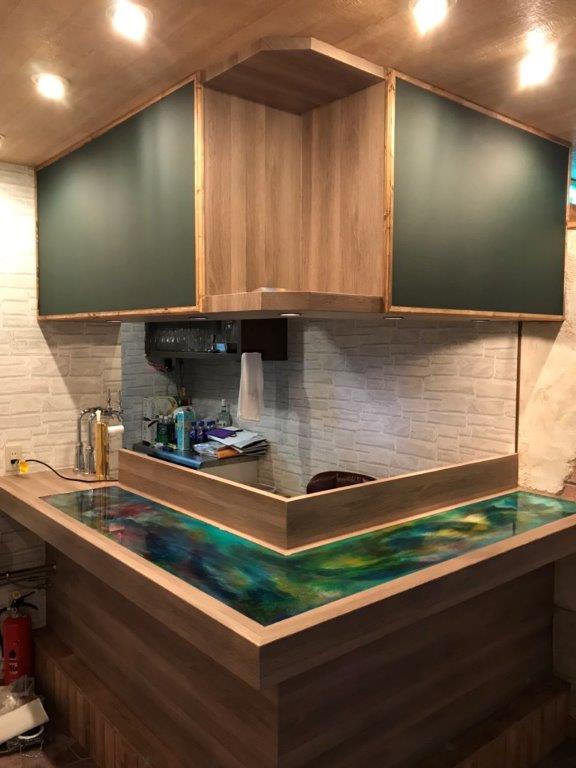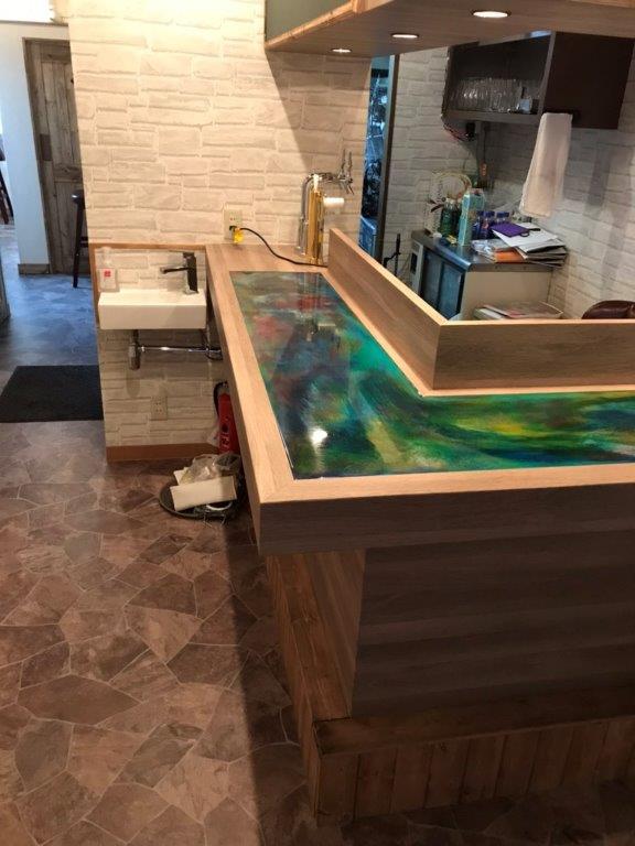エメラルド色が印象的なレジンテーブル(カウンター)の造作工事|相模原市中央区のイタリアンにて店舗の内装工事
